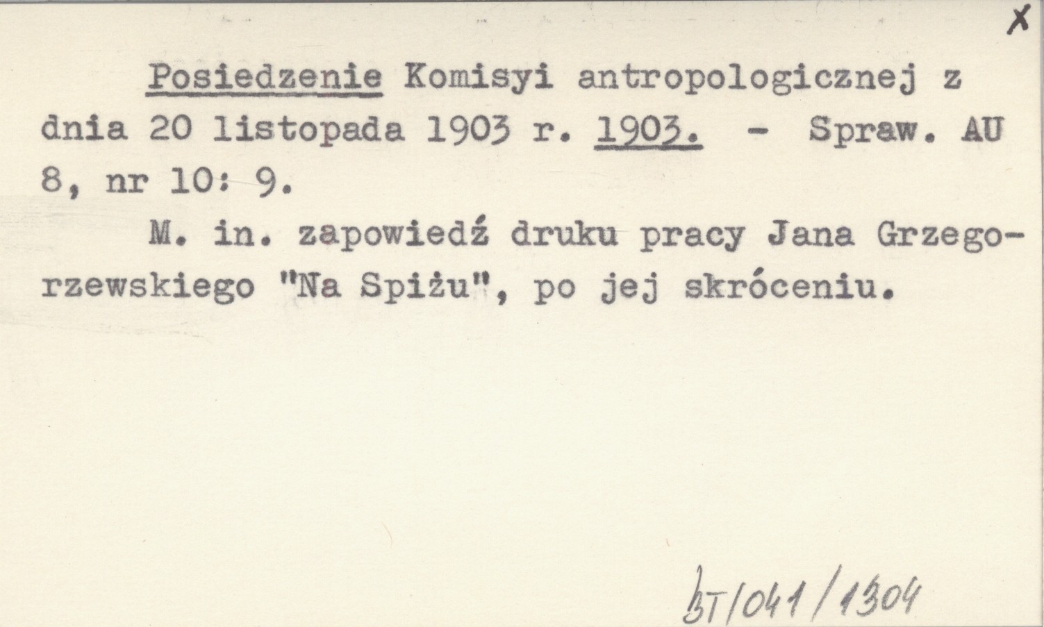 Sprawozdania Akademii Umiejętności, 8, nr 10: 9. M. in. zapowiedź druku pracy Jana Grzegorzewskiego "Na Spiżu", po jej skróceniu.