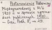 Postanowienie Podkomisyi Międzynarodowej z 12/6 1920 r. w sprawie zgromadzeń publicznych. 1920...