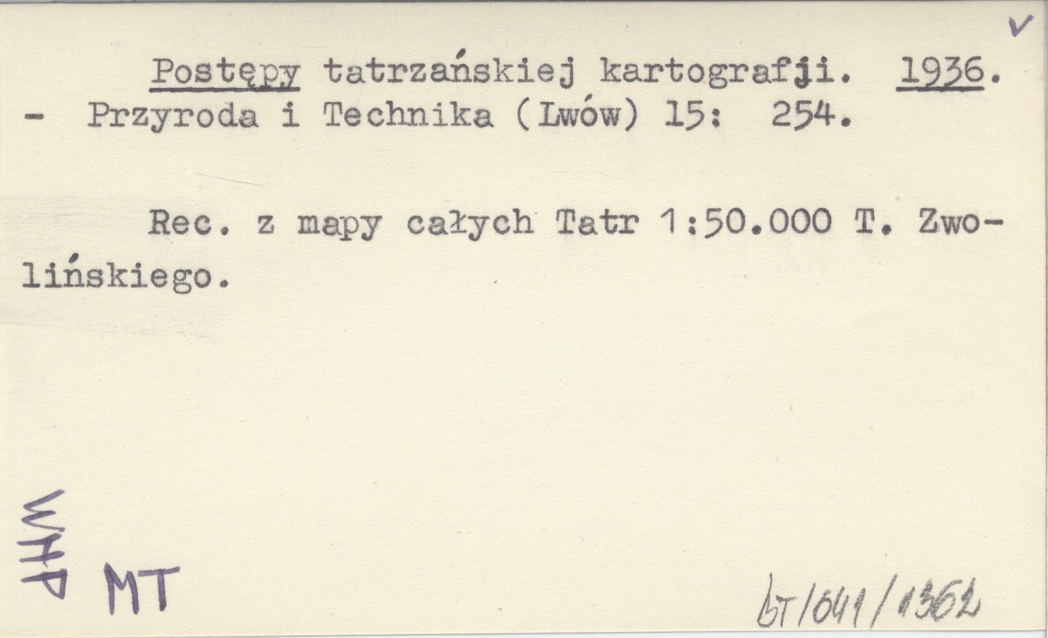 Przyroda i Technika (Lwów) , 15: 254. Recenzja z mapy całych Tatr 1:50 000 T. Zwolińskiego.