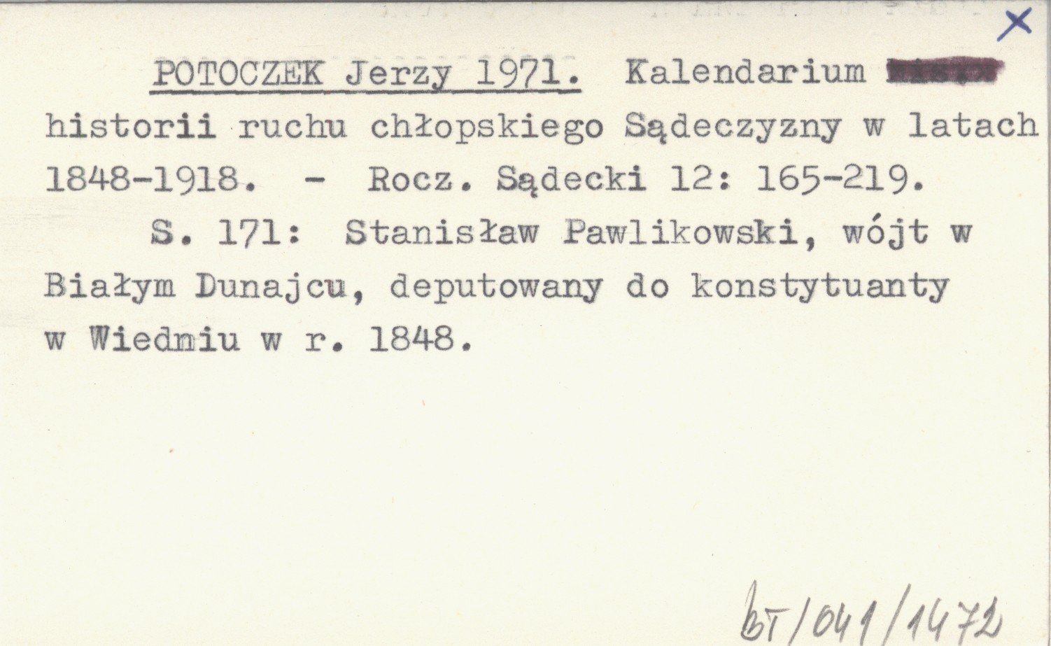 POTOCZEK Jerzy 1971 Kalendarium historii ruchu chłopskiego Sądeczyzny w latach 1848-1918.