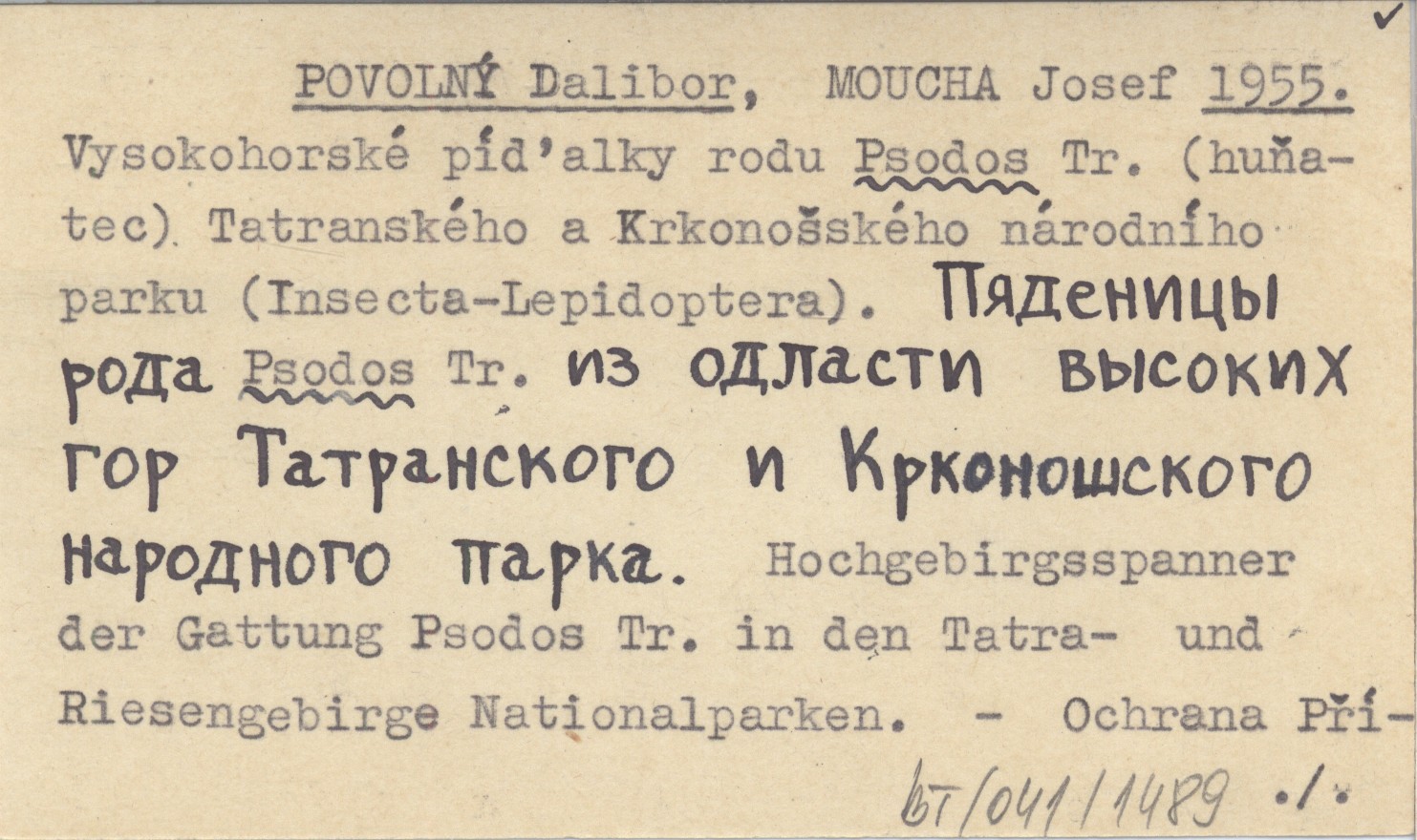 POVOLNÝ Dalibor MOUCHA, Josef. ; 1955 Vysokohorské píďalky rodu Psodos Tr. (huňatec) Tatranského a Krkonošského národního parku (Insecta-Lepidoptera). Pjadelicy poda Psodos Tr. iz odlasti vysokich gor Tatranskogo i Krkonošskogo narodnogo parka. Hochgebirgsspanner der Gattung Psodos Tr. in den Tatra- und Riesengebirge Nationalparken.