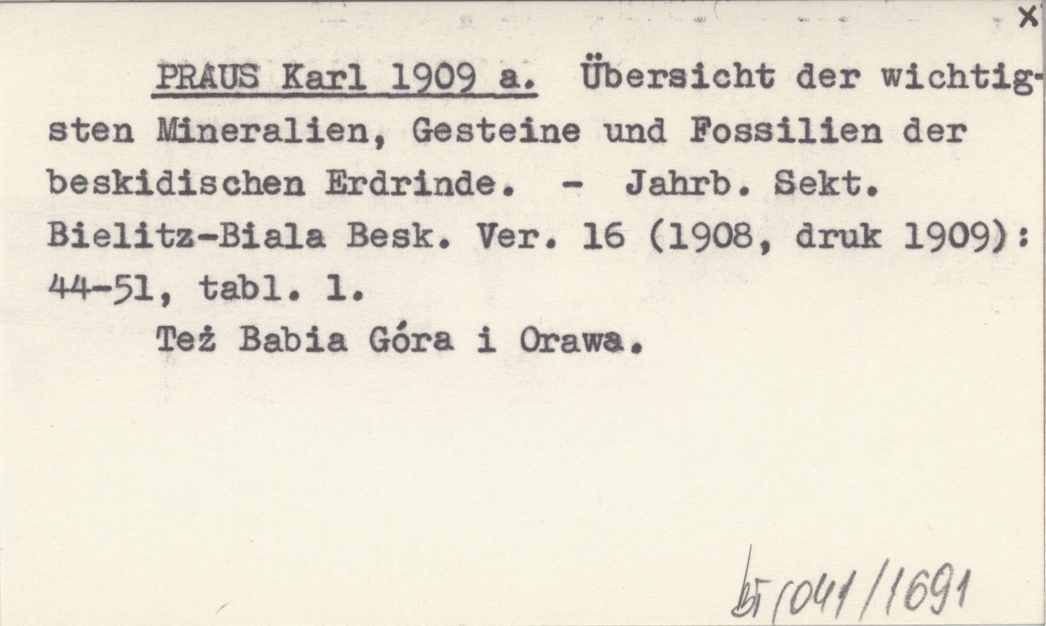 PRAUS Karl 1909 a Übersicht der wichtigsten Mineralien, Gesteine und Fossilien der beskidischen Erdrinde.