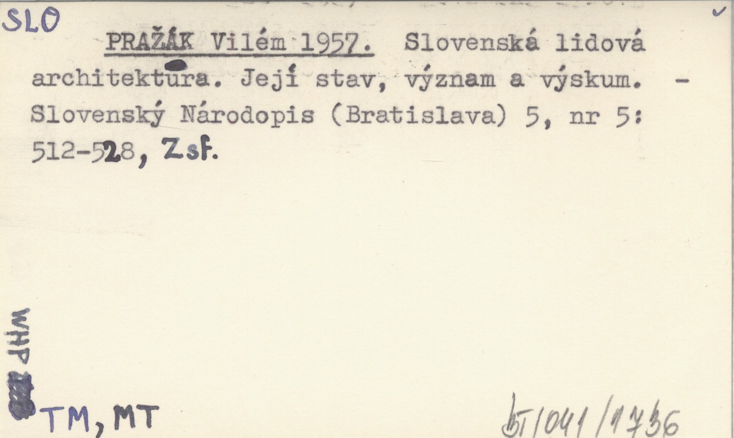 PRAŽÁK Vilém 1957 Slovenská lidová architektura. Její stav, význam a výskum.