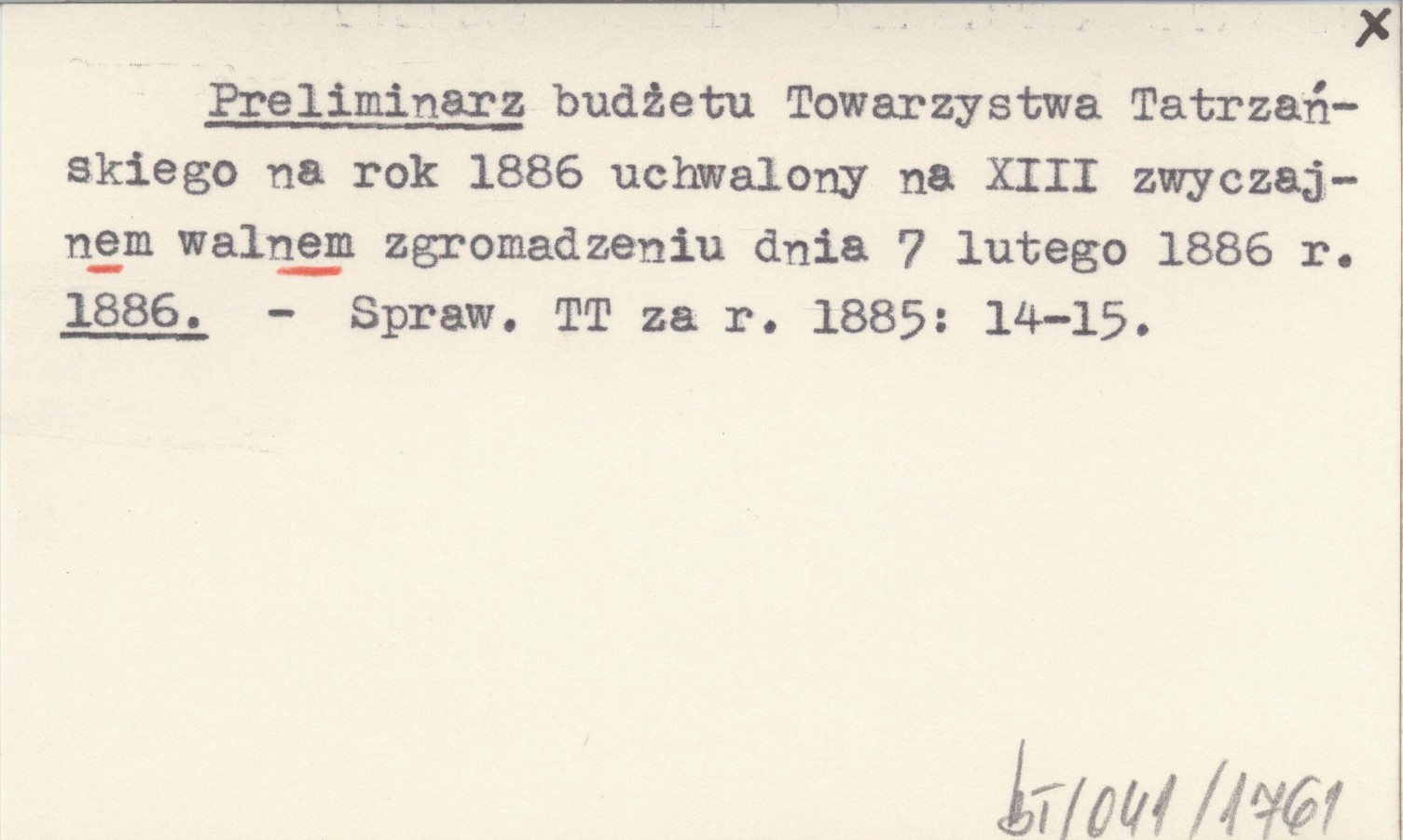Preliminarz budżetu Towarzystwa Tatrzańskiego na rok 1886, uchwalony na XIII zwyczajnem walnem Zgromadzeniu dnia 7 lutego 1886 r. 1886