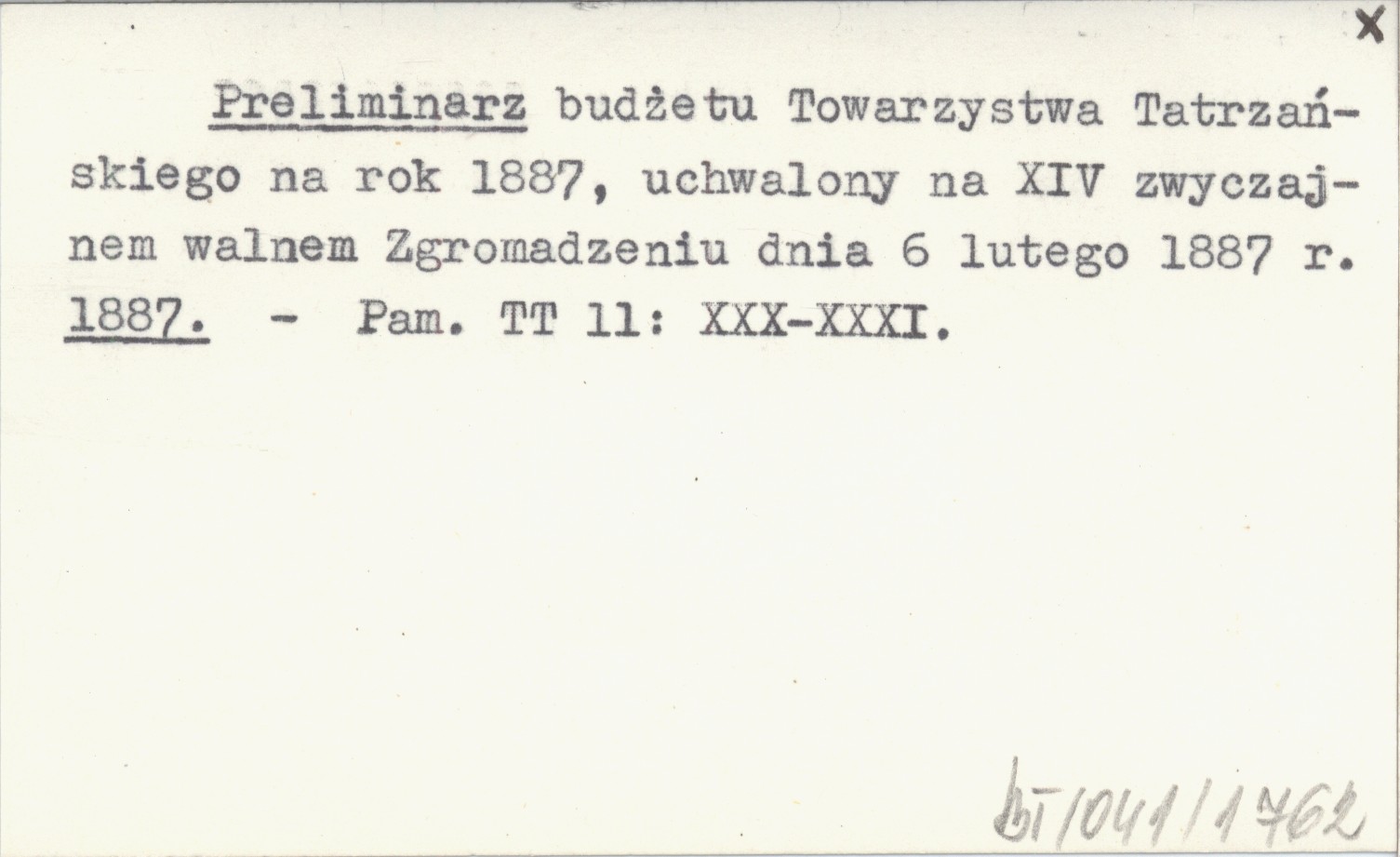 Preliminarz budżetu Towarzystwa Tatrzańskiego na rok 1887, uchwalony na XIV zwyczajnem walnem Zgromadzeniu dnia 6 lutego 1887 r. 1887