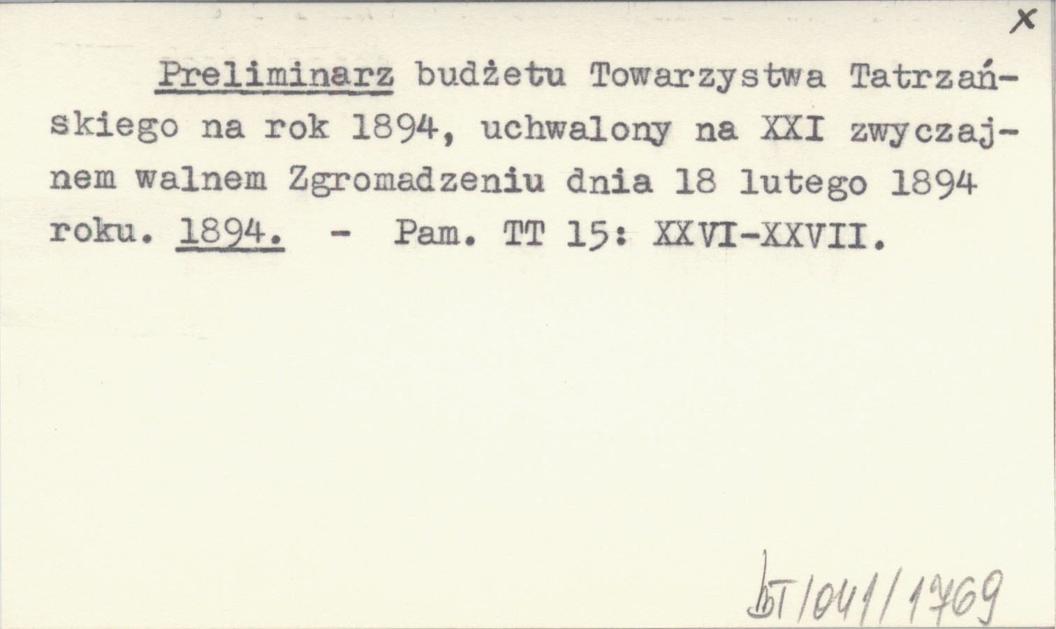 Preliminarz budżetu Towarzystwa Tatrzańskiego na rok 1894 uchwalony na XXI zwyczajnem walnem Zgromadzeniu dnia 18 lutego 1894 roku. 1894