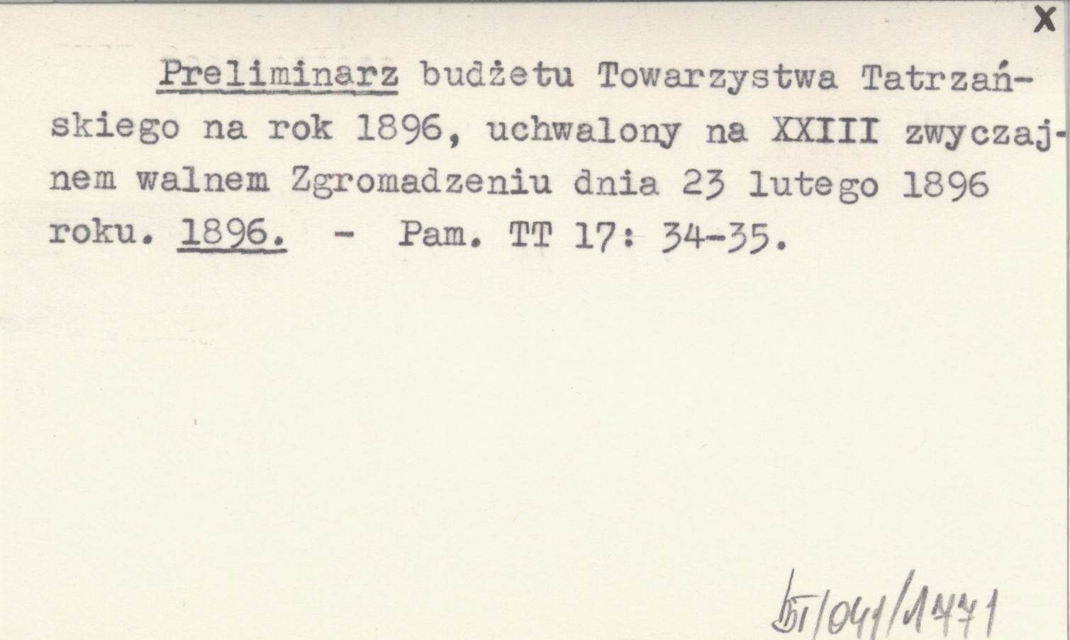 Preliminarz budżetu Towarzystwa Tatrzańskiego na rok 1896, uchwalony na XXIII zwyczajnem walnem Zgromadzeniu dnia 23 lutego 1896 roku. 1896
