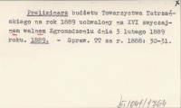 Preliminarz budżetu Towarzystwa Tatrzańskiego na rok 1889, uchwalony na XVI zwyczajnem walnem Zgromadzeniu dnia 3 lutego 1889 roku. 1889