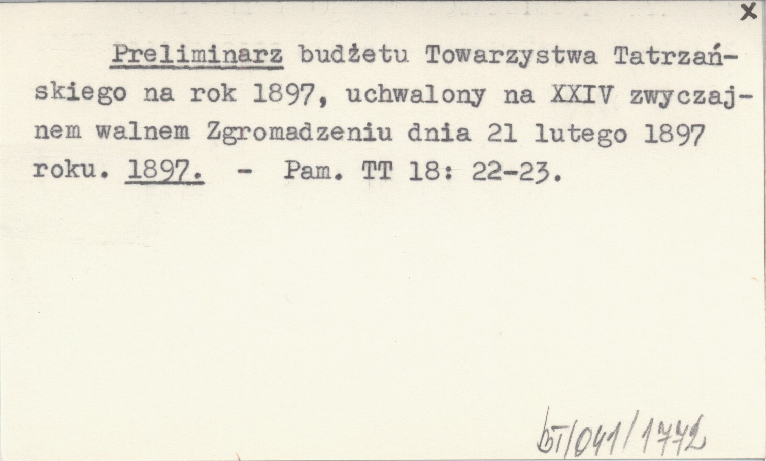 Preliminarz budżetu Towarzystwa Tatrzańskiego na rok 1897, uchwalony na XXIV zwyczajnem walnem Zgromadzeniu dnia 21 lutego 1897 roku. 1897