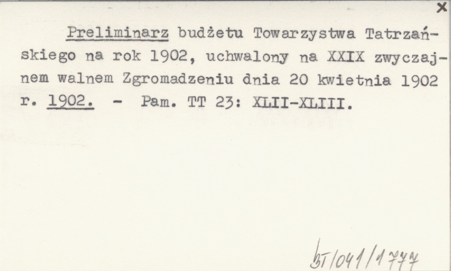 Preliminarz budżetu Towarzystwa Tatrzańskiego na rok 1902, uchwalony na XXIX zwyczajnem walnem Zgromadzeniu dnia 20 kwietnia 1902 r. 1902