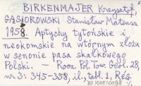 BIRKENMAJER Krzysztof GĄSIOROWSKI, Stanisław Mateusz. ; 1958 Aptychy tytońskie i neokomskie na wtórnym złożu w senonie pasa skałkowego Polski.