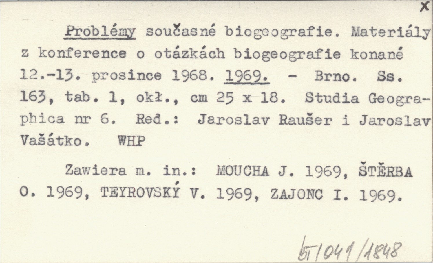 souèasné biogeografie. Materiály z konference o otázkách biogeografie konané 12.-13. prosince 1968.