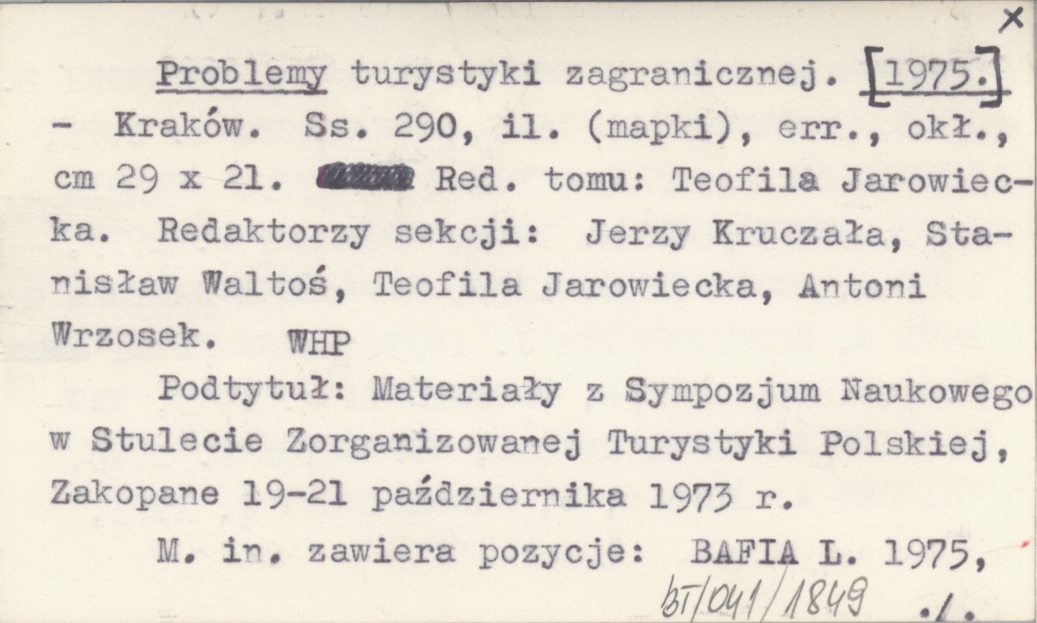 RED: JAROWIECKA, Teofila. ; Problemy turystyki zagranicznej. Materiały z Sympozjum Naukowego w Stulecie Zorganizowanej Turystyki Polskiej. Zakopane 19-21 października 1973 r. [1975]