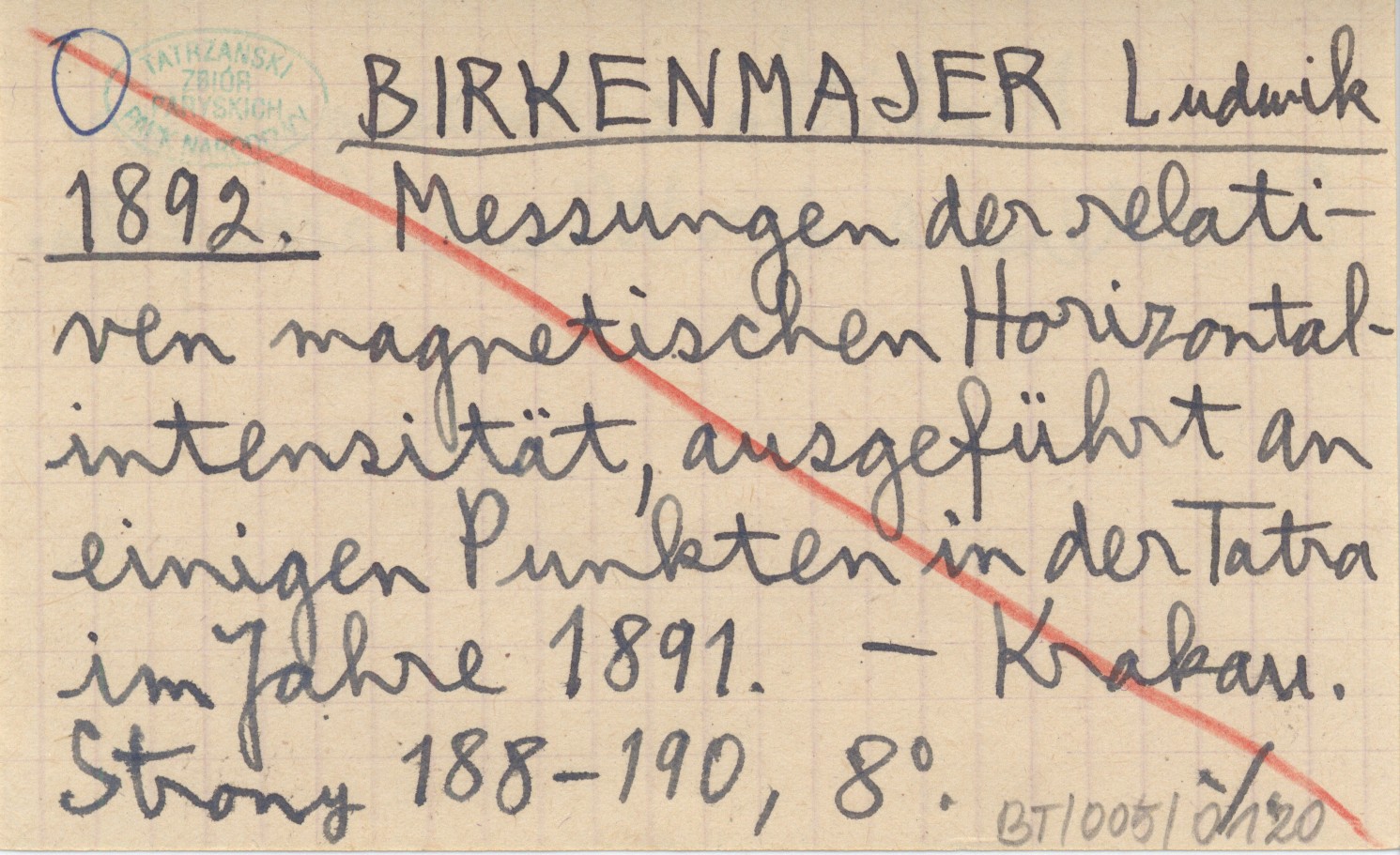 BIRKENMAJER Ludwik 1892 Messungen der relativen magnetischen Horizontalintensität, ausgeführt an einigen Punkten in der Tatra im Jahre 1891.