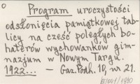 Program uroczystości odsłonięcia pamiątkowej tablicy na cześć poległych bohaterów wychowanków gimnazjum w Nowym Targu. 1922...
