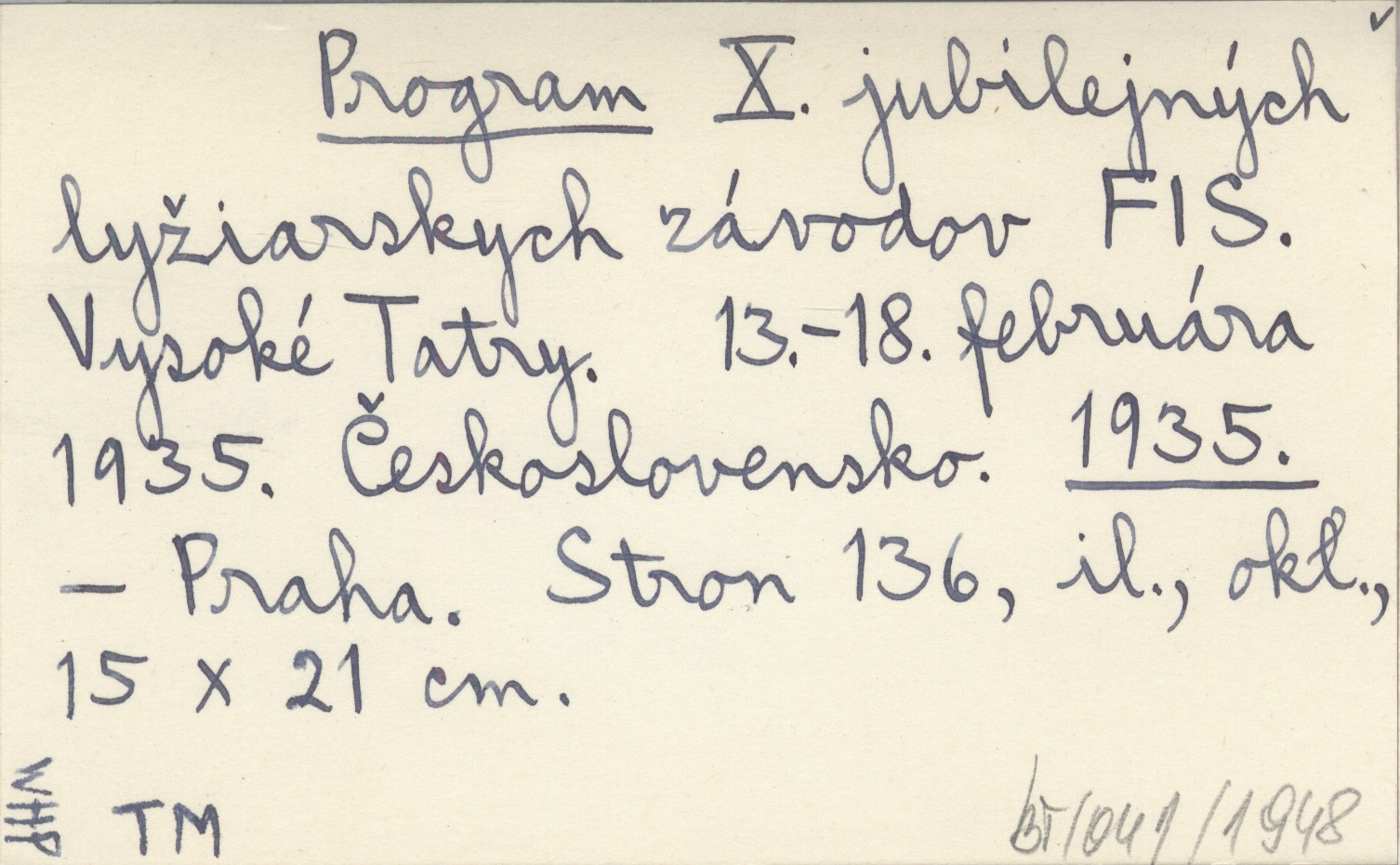 Program X. jubilejných lyžiarskych závodov FIS. Vysoké Tatry. 13.-18. februára 1935. Československo. 1935