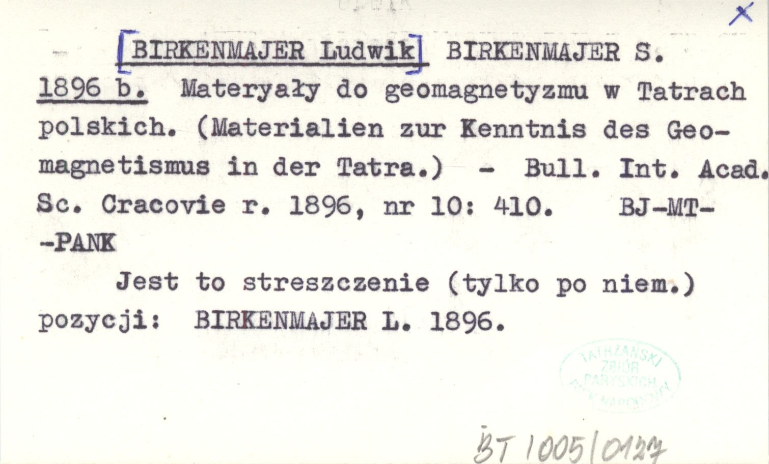 [BIRKENMAJER Ludwik] BIRKENMAJER, S. ; 1896 b Materyały do geomagnetyzmu w Tatrach polskich. (Materialien zur Kenntnis des Geomagnetismus in der Tatra.)