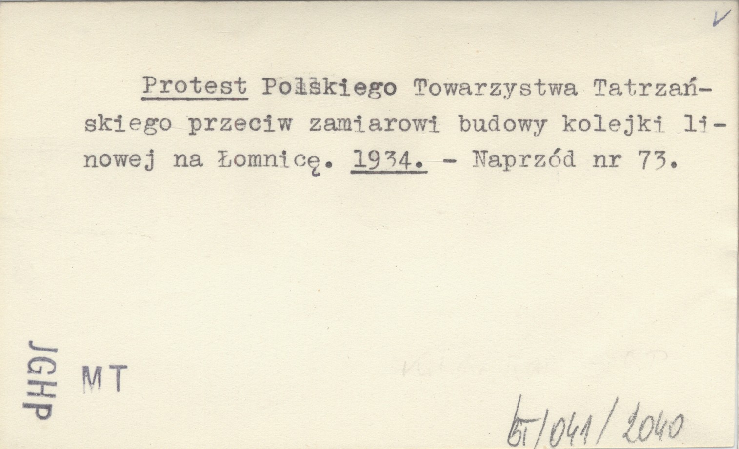 Protest Polskiego Towarzystwa Tatrzańskiego przeciw zamiarowi budowy kolejki linowej na Łomnicę. 1934