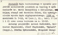Protokół Sądu konkursowego w sprawie projektów architektów polskich na kaplicę w myśl zamiarów hr. Marii Zamoyskiej z Zakopanego, mającą stanąć nad Morskiem Okiem, dla upamiętnienia wyroku Sądu międzynarodowego. 1908 a