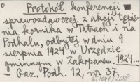 Protokół konferencji sprawozdawczej z akcji tępienia kornika w Tatrach i na Podhalu, odbytej w dniu 9 sierpnia 1924 w Urzędzie gminnym w Zakopanem. 1924...