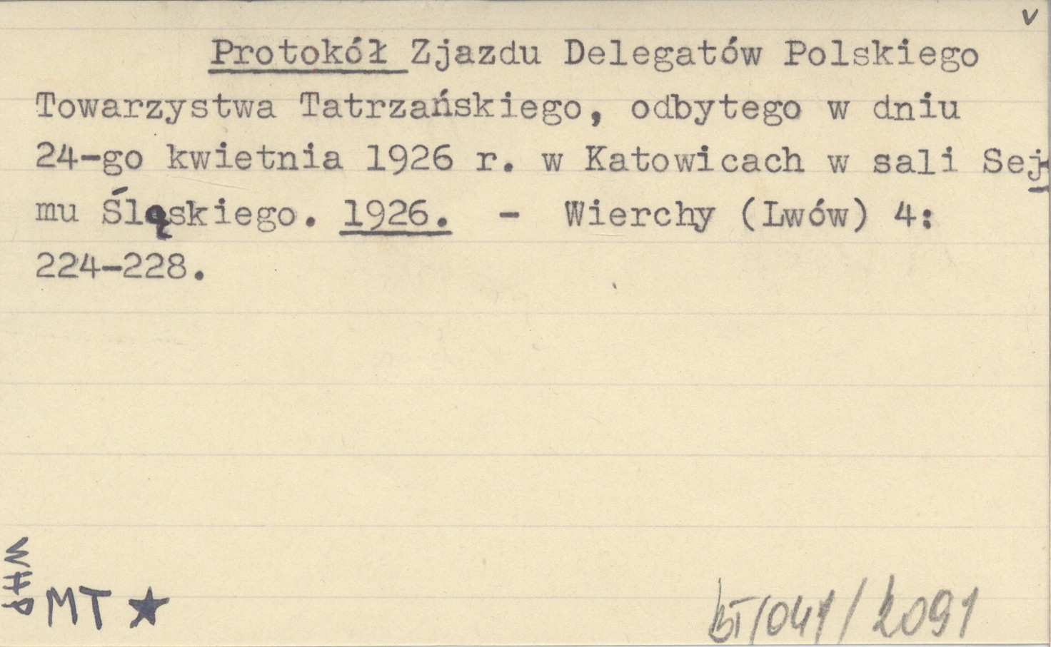 Protokół zjazdu Delegatów Polskiego Towarzystwa Tatrzańskiego, odbytego w dniu 24-go kwietnia 1926 r. w Katowicach w sali Sejmu Śląskiego. 1926