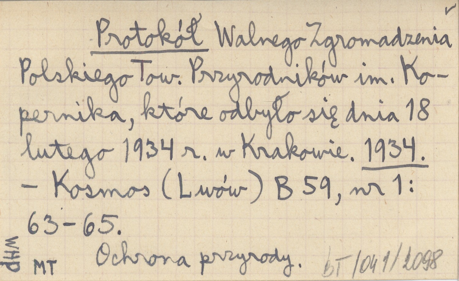 Protokół Walnego Zgromadzenia Polskiego Tow. Przyrodników im. Kopernika, które odbyło się dnia 18 lutego 1934 r. w Krakowie. 1934