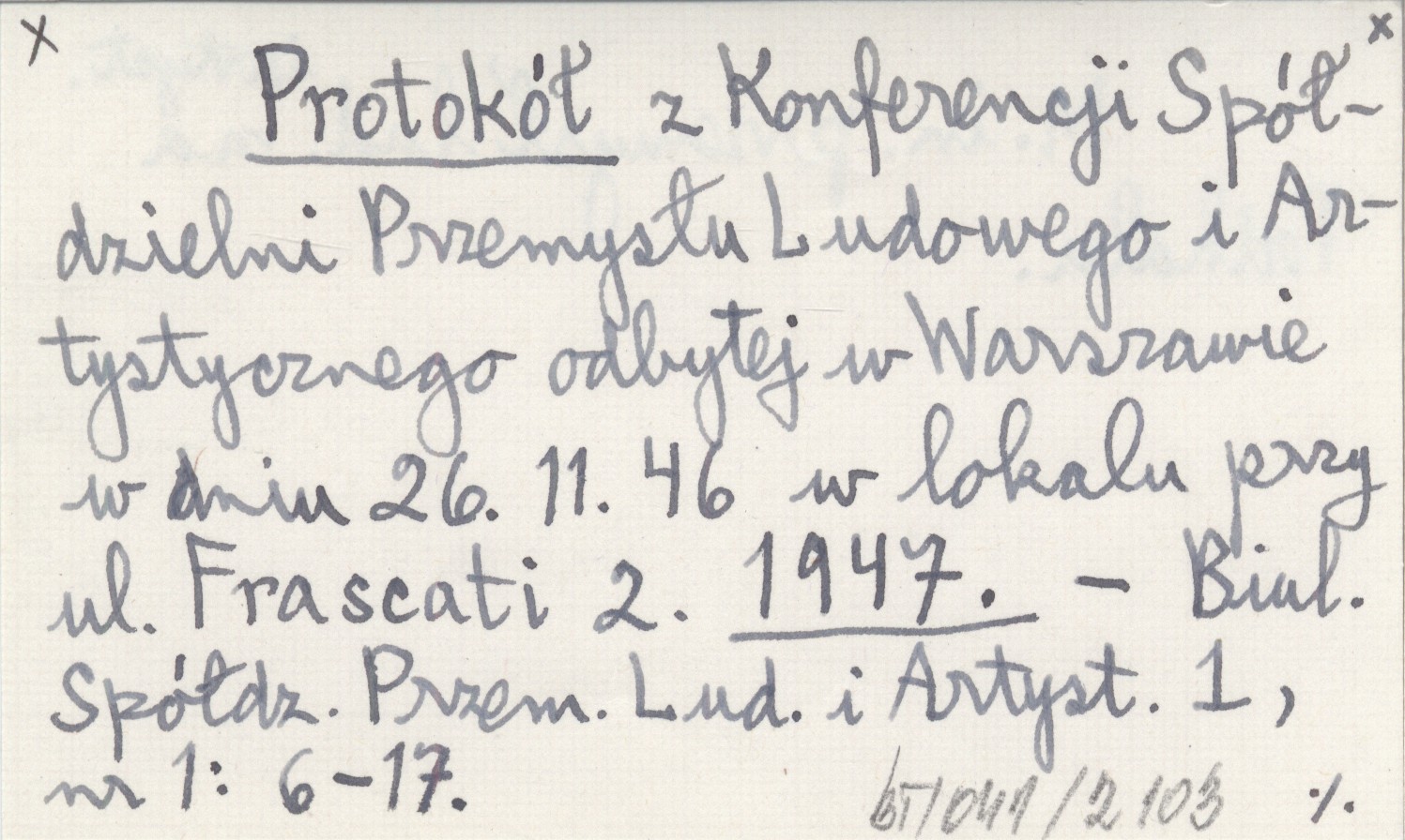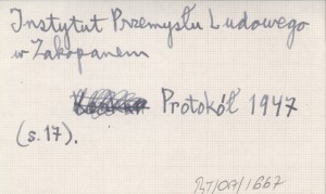 Protokół z Konferencji Spółdzielni Przemysłu Ludowego i Artystycznego odbytej w Warszawie w dniu 26.11.46 w lokalu przy ul. Fracsati 2. 1947