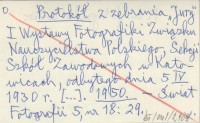 Protokół z zebrania "Jury" I Wystawy Fotografiki Związku Nauczycielstwa Polskiego, Sekcji Szkół Zawodowych w Katowicach, odbytego dnia 5 IV 1930 r. 1950
