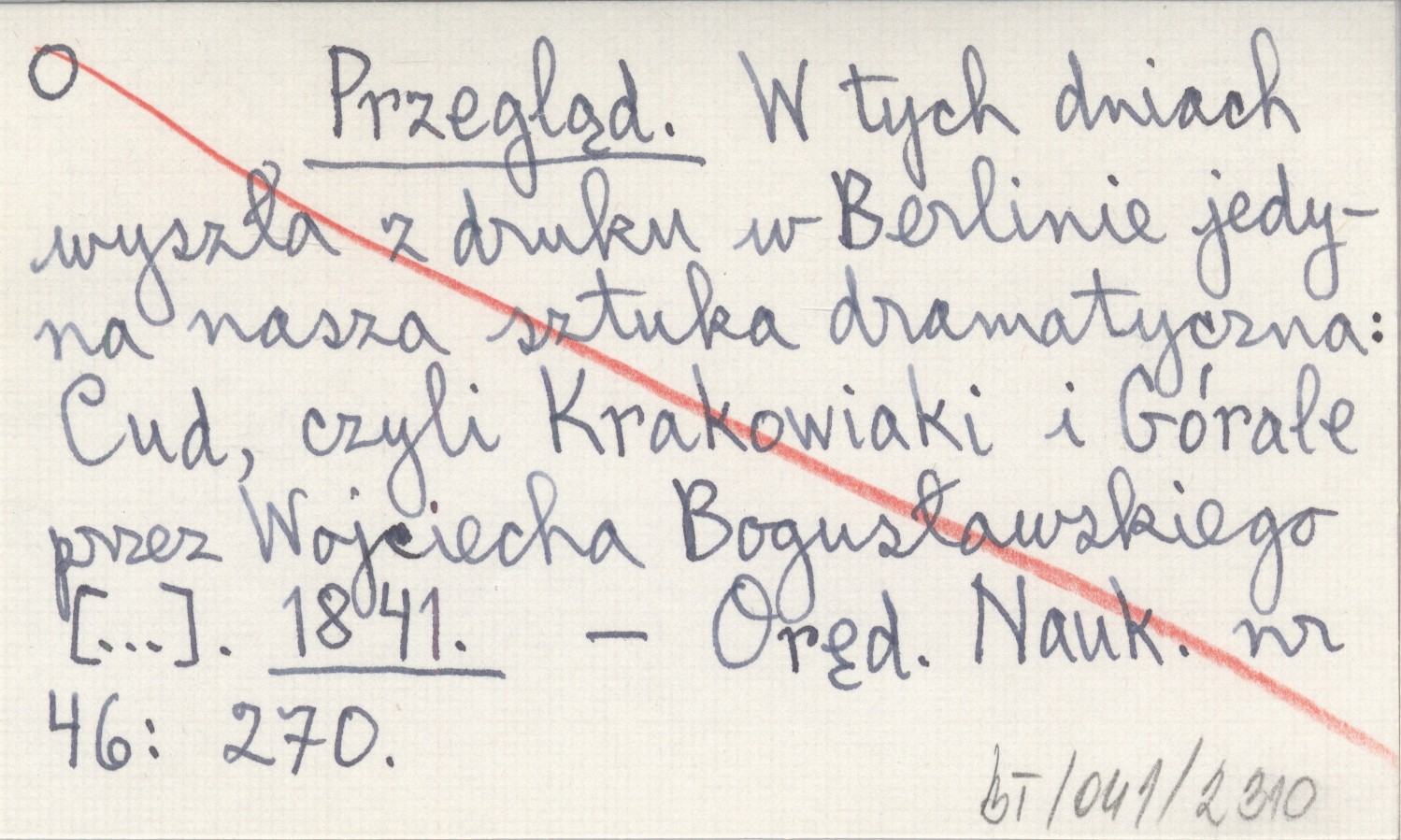 Przegląd. W tych dniach wyszła z druku w Berlinie jedyna nasza sztuka dramatyczna: Cud, czyli Krakowiaki i Górale przez Wojciecha Bogusławskiego [...]. 1841
