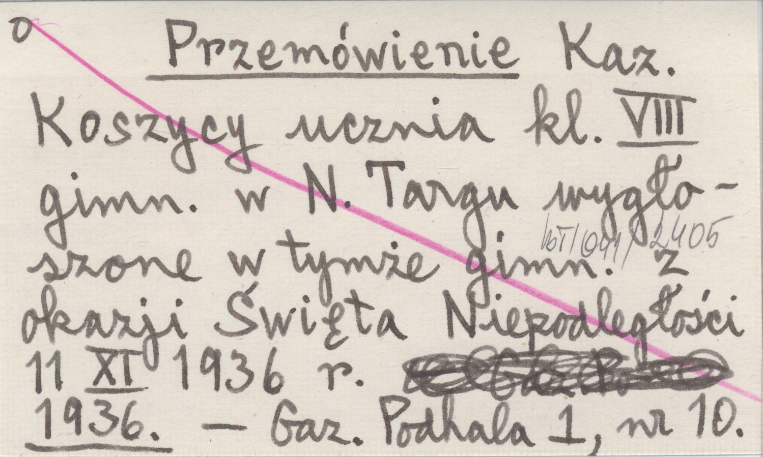 Przemówienie Kaz. Koszycy ucznia kl. VIII gimn. w N. Targu wygłoszone w tymże gimn. z okazji Święta Niepodległości 11 XI 1936 r. 1936