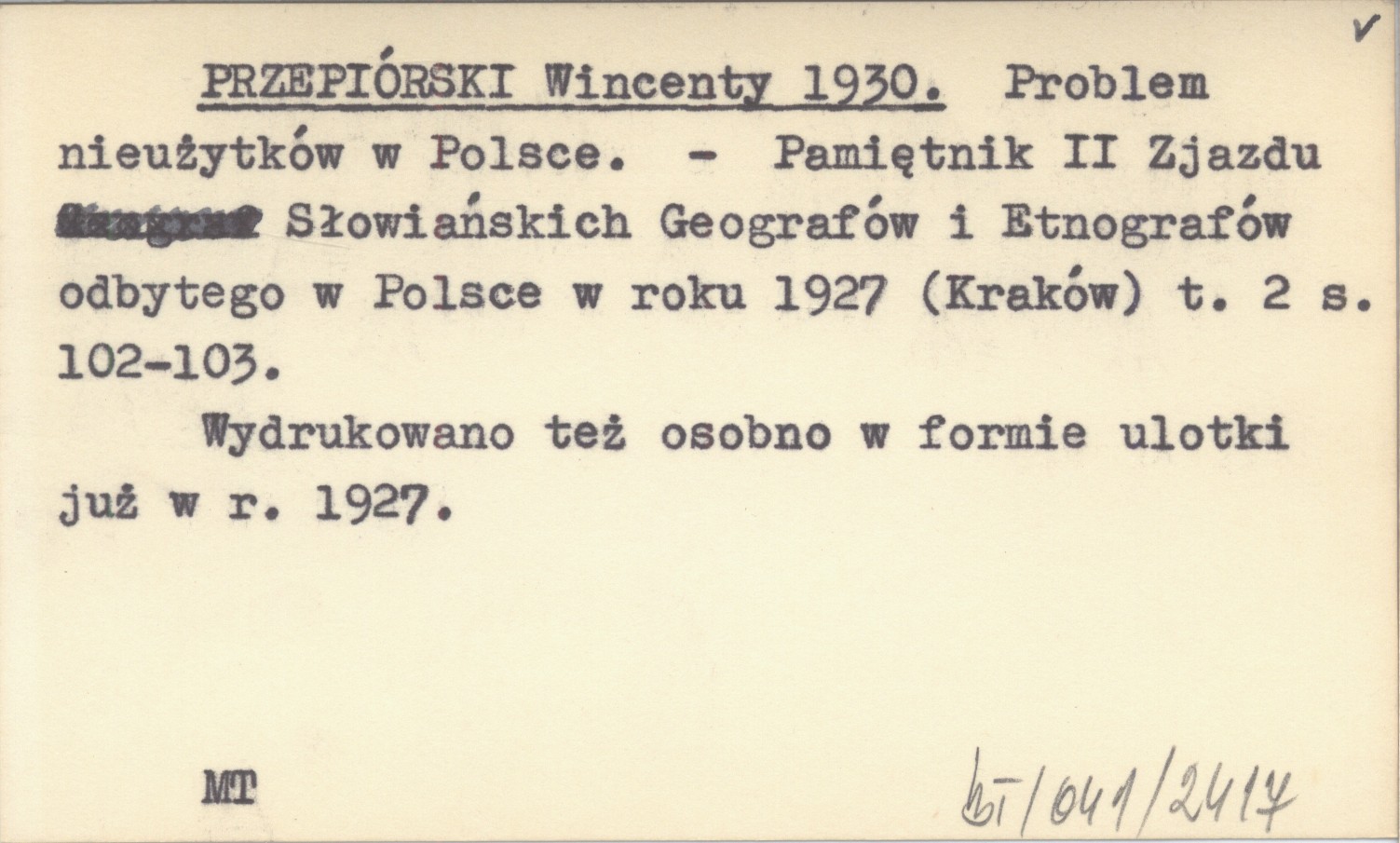 Pamiętnik II Zjazdu Słowiańskich Geografów i Etnografów odbytego w Polsce w roku 1927. Kraków , T. 2: 102-103. Wydrukowano też osobno w formie ulotki już w r. 1927.