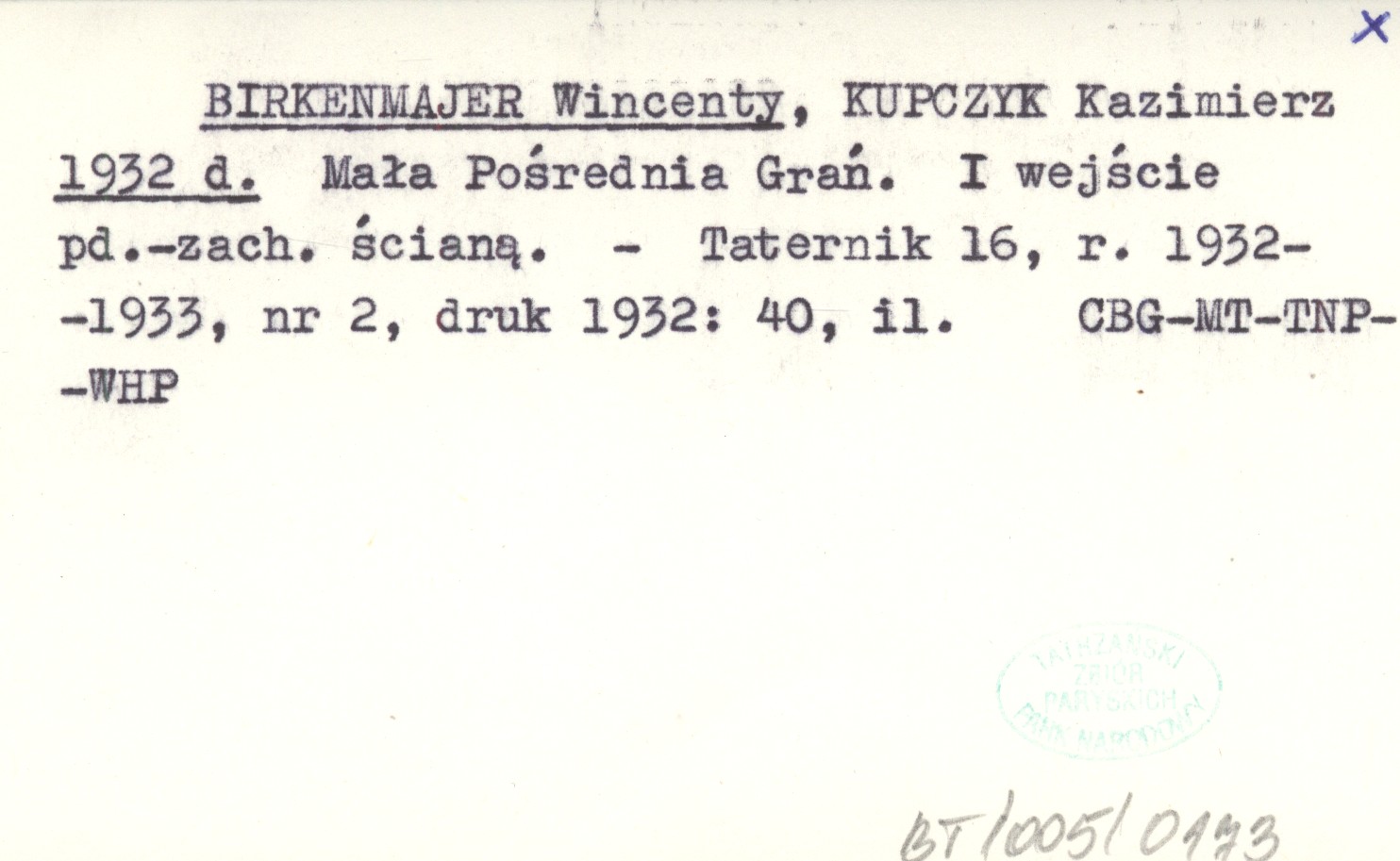 BIRKENMAJER Wincenty KUPCZYK, Kazimierz. ; 1932 d Mała Pośrednia Grań. I wejście pd.-zach. ścianą.