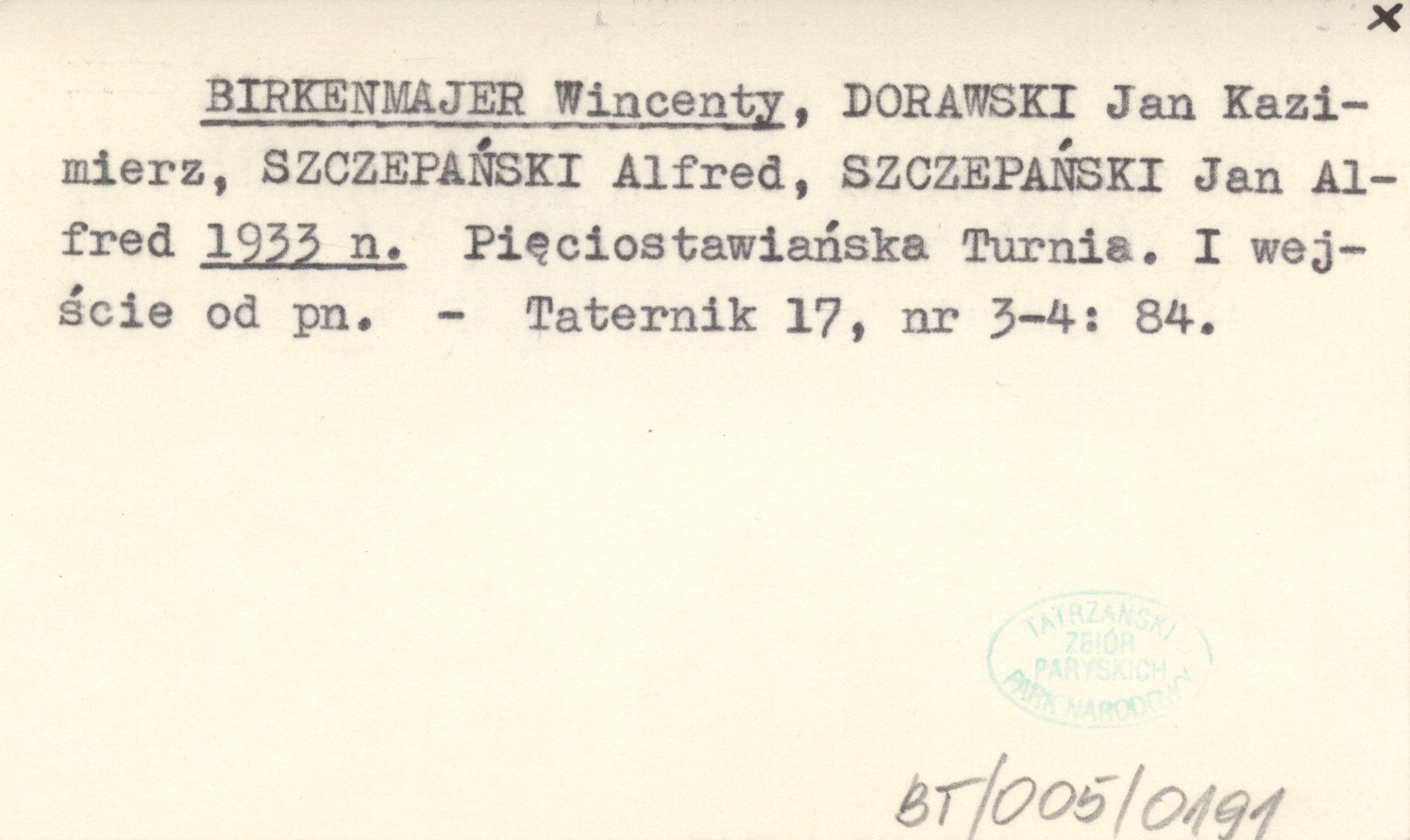 BIRKENMAJER Wincenty DORAWSKI, Jan Kazimierz. ; SZCZEPAŃSKI, Alfred. ; SZCZEPAŃSKI, Jan Alfred. ; 1933 n Pięciostawiańska Turnia. I wejście od pn.