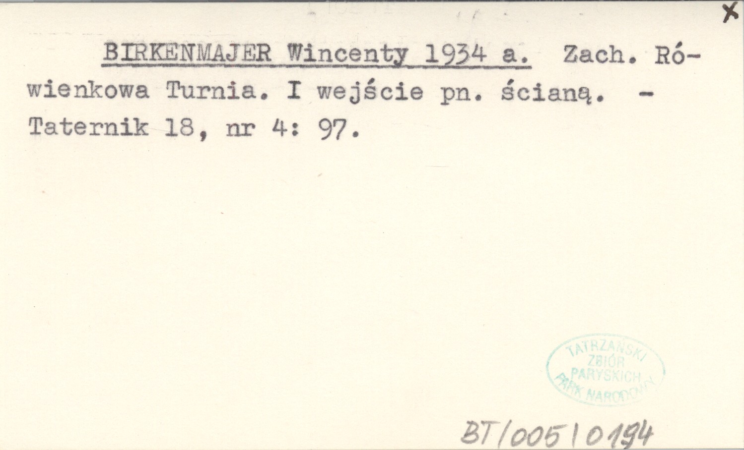 BIRKENMAJER Wincenty 1934 a Zach. Rówienkowa Turnia. I wejście pn. ścianą.