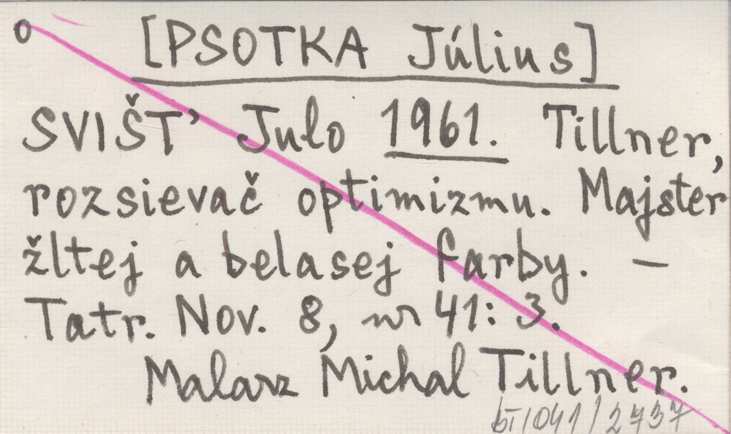 [PSOTKA Július] SVIŠŤ, Julo. ; 1961 Tillner, rozsievač optimizmu. Majster žltej a belasej farby.