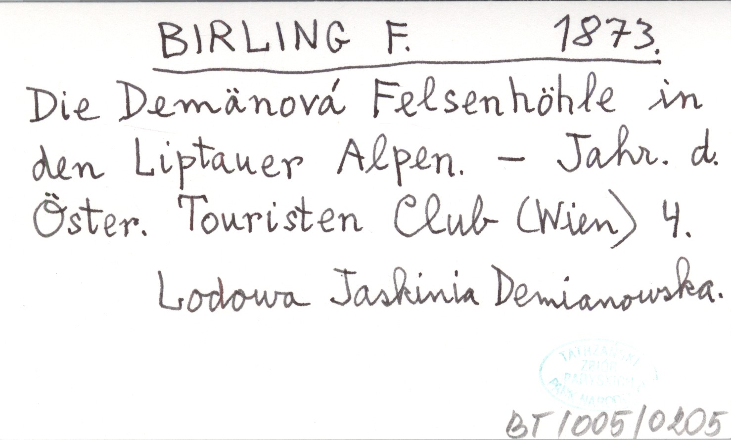 BIRLING F. 1873 Die Demänová Felsenhöhle in den Liptauer Alpen.