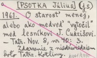 (js) [PSOTKA Július] 1961 O starosť menej, alebo ako medveď "vytočil" med lesníkovi J. Cudzišovi.