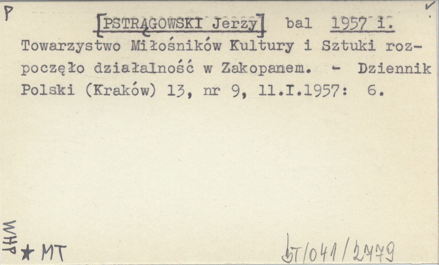 bal [PSTRĄGOWSKI Jerzy] 1957 i Towarzystwo Miłośników Kultury i Sztuki rozpoczęło działalność w Zakopanem.