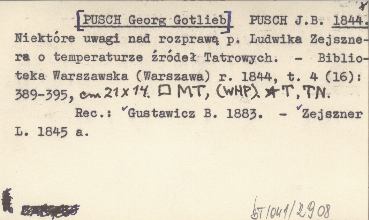 PUSCH J. B. [PUSCH Georg Gotlieb] 1844 Niektóre uwagi nad rozprawą p. Ludwika Zejsznera o temperaturze źródeł Tatrowych.