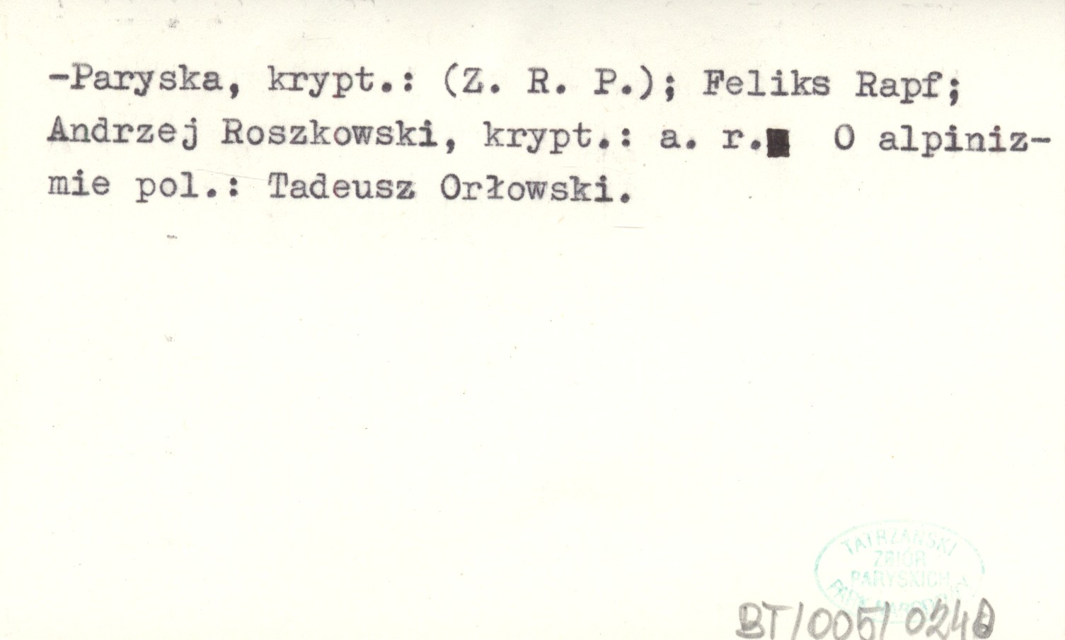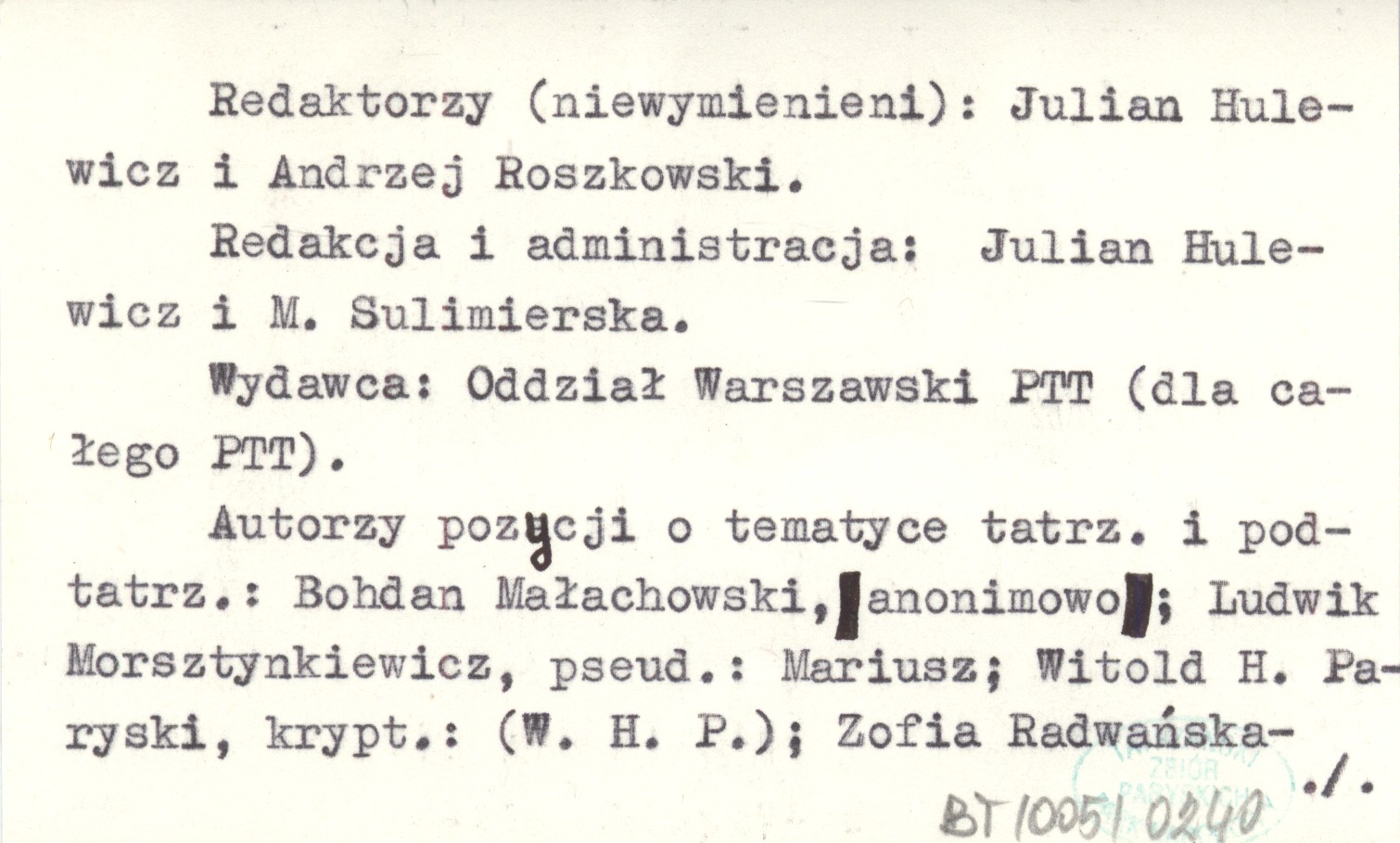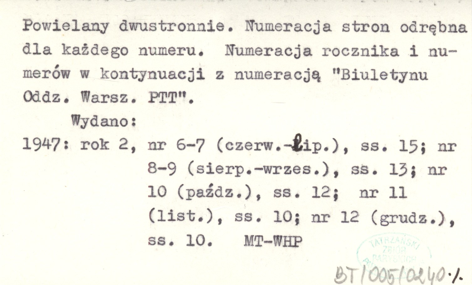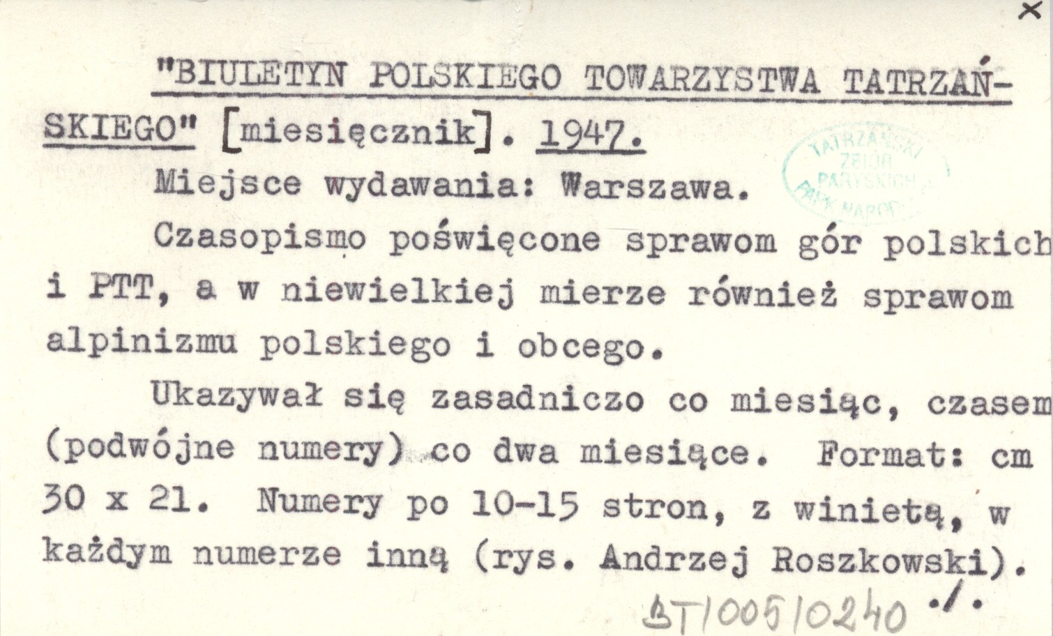 BIULETYN POLSKIEGO TOWARZYSTWA TATRZAŃSKIEGO R. 1947: nr 6-7 (czerw.-lip.): 15 ; nr 8-9 (sierp.-wrzes.): 13 ; nr 10 (paźdz.): 12 ; nr 11 (list.): 10 ; nr 12 (grudz.): 10, 30x21 cm. Warszawa Oddział Warszawski PTT, Czasopismo poświęcone sprawom gór polskich i PTT, a w niewielkiej mierze również sprawom alpinizmu polskiego i obcego. Ukazywał się zasadniczo co miesiąc, czasem (podwójne numery) co dwa miesiące. Numery po 10-15 stron, z winietą, w każdym numerze inną (rys. Andrzej Roszkowski). Powielany dwustronnie. Numeracja stron odrębna dla każdego numeru. Numeracja rocznika i numerów w kontynuacji z numeracją "Biuletynu Oddz. Warsz. PTT". Redakcja i administracja: Julian HULEWICZ i M. SULIMIERSKA. Autorzy pozycji o tematyce tatrz. i podtatrz.: Bohdan Małachowski, anonimowo; Ludwik Morsztynkiewicz, pseud.: Mariusz; Witold H. Paryski, krypt.: (W. H. P.); Zofia Radwańska-Paryska, krypt.: (Z. R. P.); Feliks Rapf; Andrzej Roszkowski, krypt.: a. r. O alpinizmie pol.: Tadeusz Orłowski.