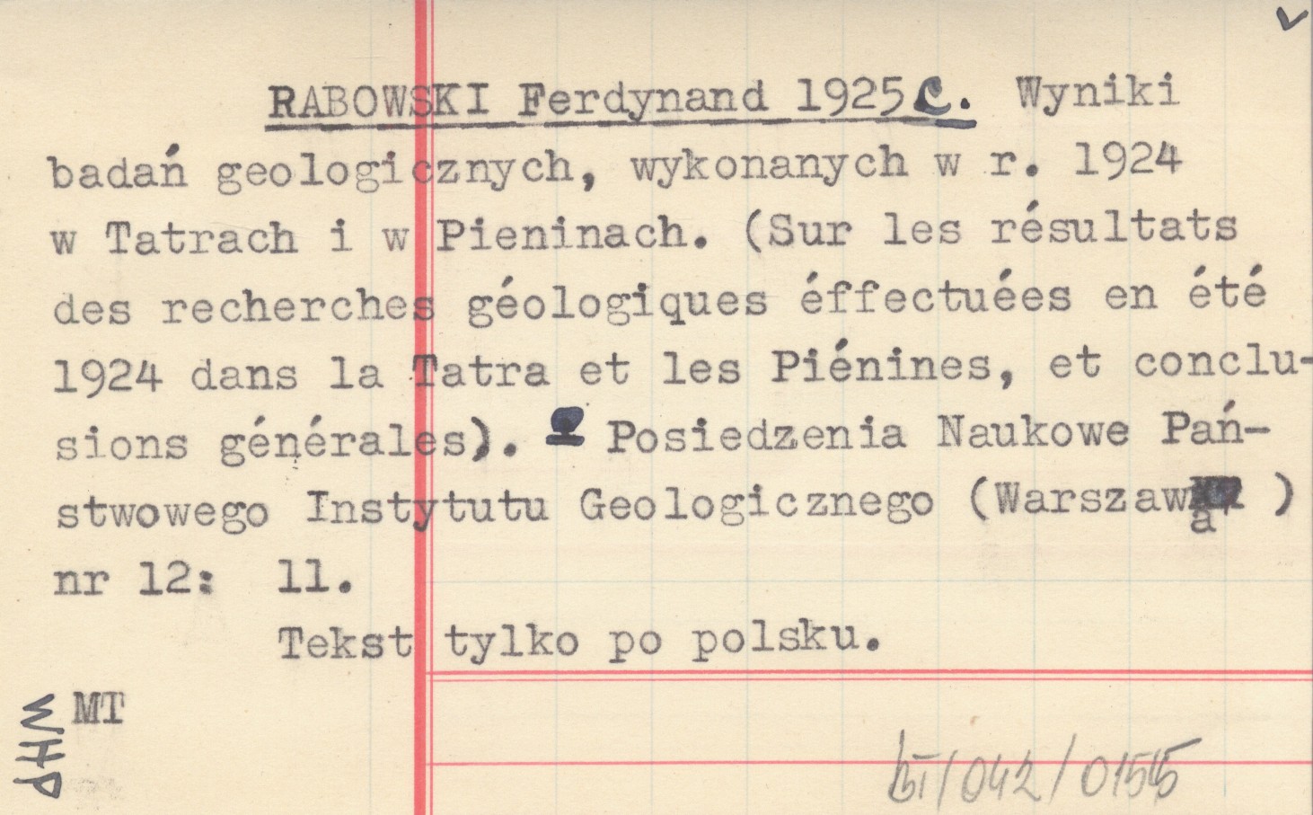 RABOWSKI Ferdynand 1925 c Wyniki badań geologicznych, wykonanych w r. 1924 w Tatrach i w Pieninach. (Sur les résultats des recherches géologiques éffectuées en été 1924 dans la Tatra et les Piénines, et conclusions générales).