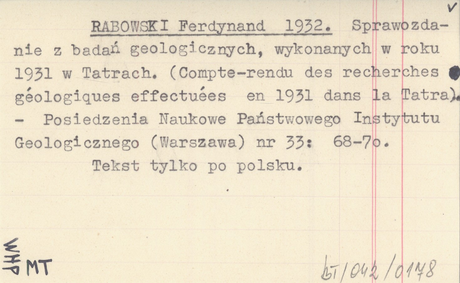 RABOWSKI Ferdynand 1932 Sprawozdanie z badań geologicznych, wykonanych w roku 1931 w Tatrach. (Compte-rendu des recherches géologiques effectuées en 1931 dans la Tatra).