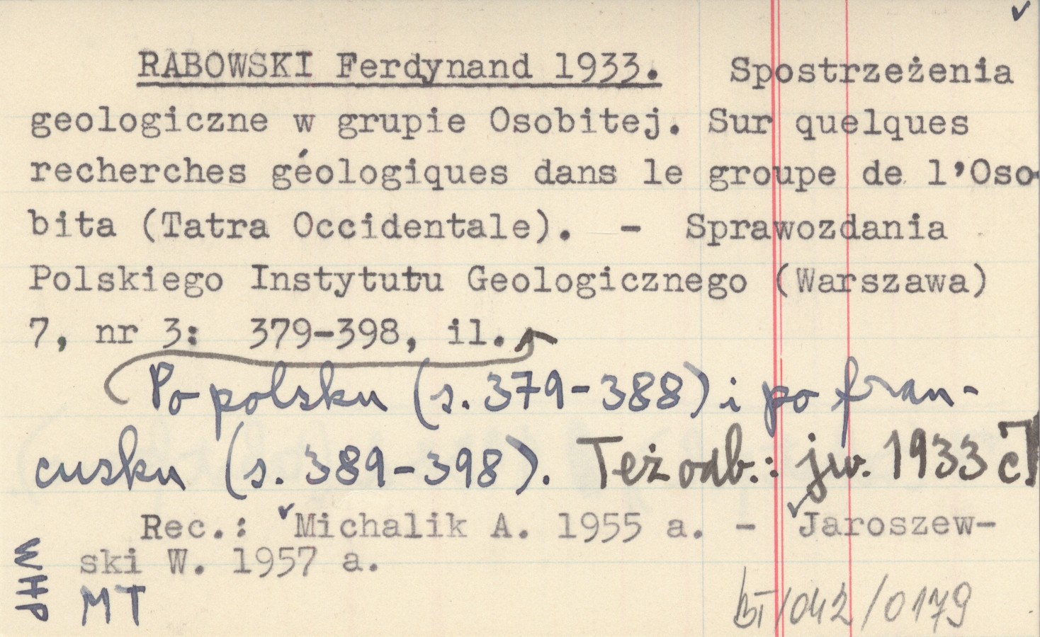 RABOWSKI Ferdynand 1933 Spostrzeżenia geologiczne w grupie Osobitej. Sur quelques recherches géologiques dans la groupe de l'Osobita (Tatra Occidentale).