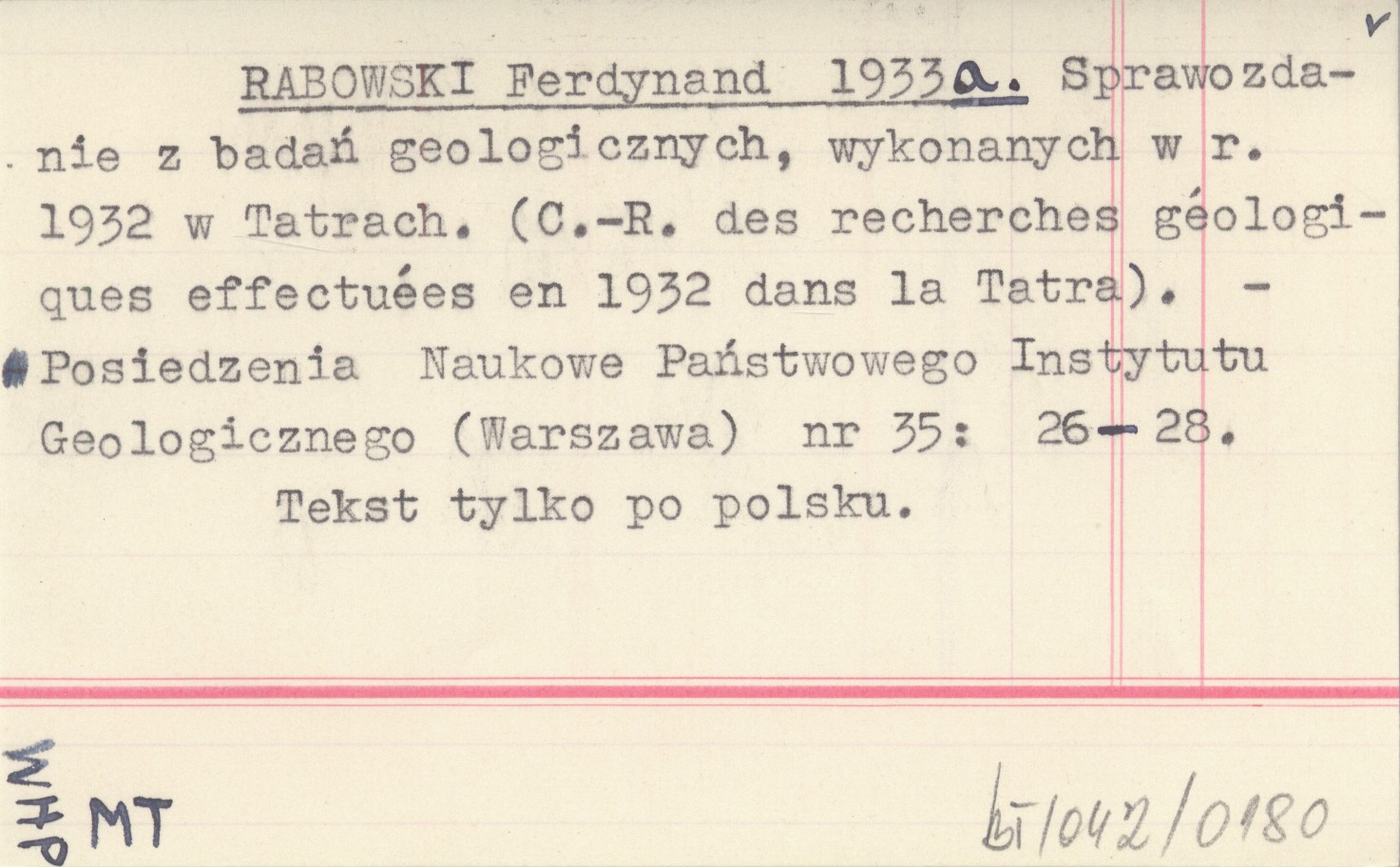 RABOWSKI Ferdynand 1933 a Sprawozdanie z badań geologicznych, wykonanych w r. 1932 w Tatrach. (C.-R. des recherches géologiques effectuées en 1932 dans la Tatra).