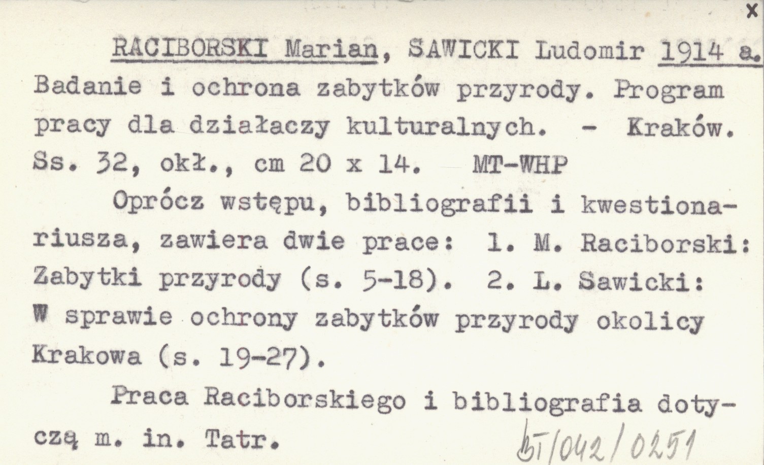 Kraków , 32 s., okł., 20x14 cm. Praca Raciborskiego i bibliografia dotyczą m. in. Tatr. Oprócz wstępu, bibliografii i kwestionariusza, zawiera dwie prace: 1. M. Raciborski: Zabytki przyrody (s. 5-18). 2. L. Sawicki: W sprawie ochrony zabytków przyrody okolicy Krakowa (s. 19-27).