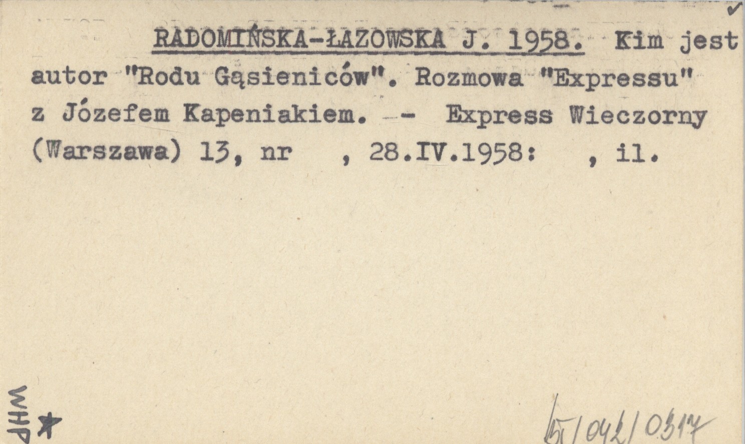 RADOMIŃSKA-ŁAZOWSKA J. 1958 Kim jest autor "Rodu Gąsieniców". Rozmowa "Expressu" z Józefem Kapeniakiem.