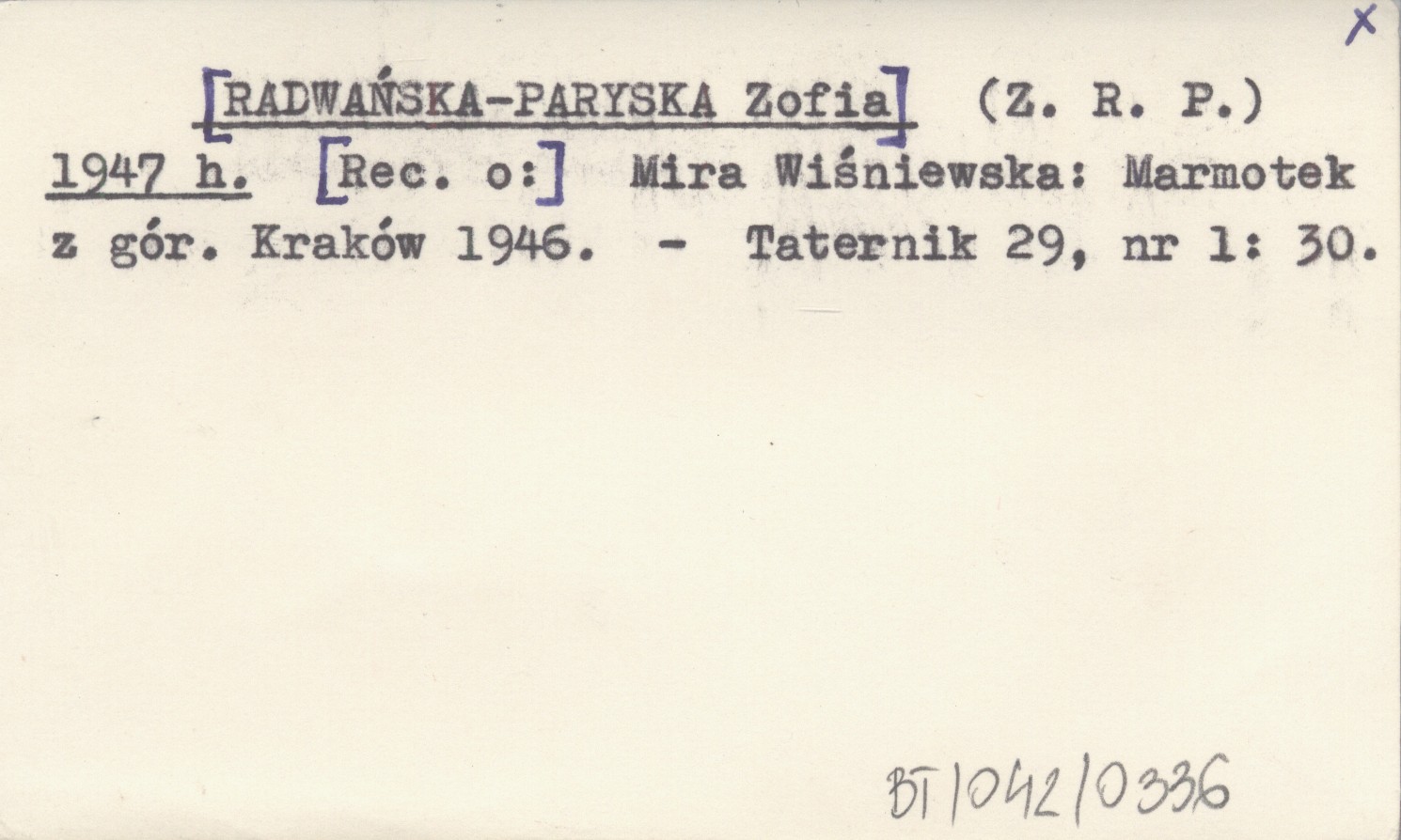 (Z. R. P.) [RADWAŃSKA-PARYSKA Zofia] 1947 h [Rec. o:] Mira Wiśniewska: Marmotek z gór. Kraków 1946.