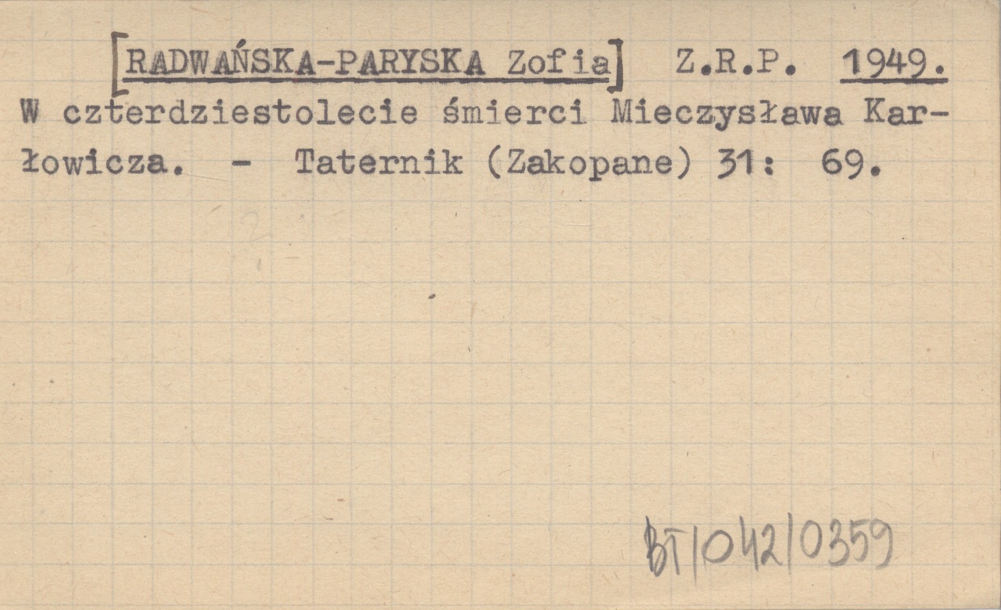 Z. R. P. [RADWAŃSKA-PARYSKA Zofia] 1949 W czterdziestolecie śmierci Mieczysława Karłowicza.