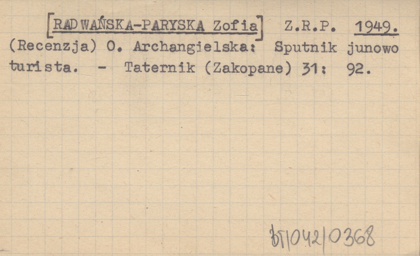 Z. R. P. [RADWAŃSKA-PARYSKA Zofia] 1949 (Recenzja) O. Archangielska: Sputnik junowo turista.