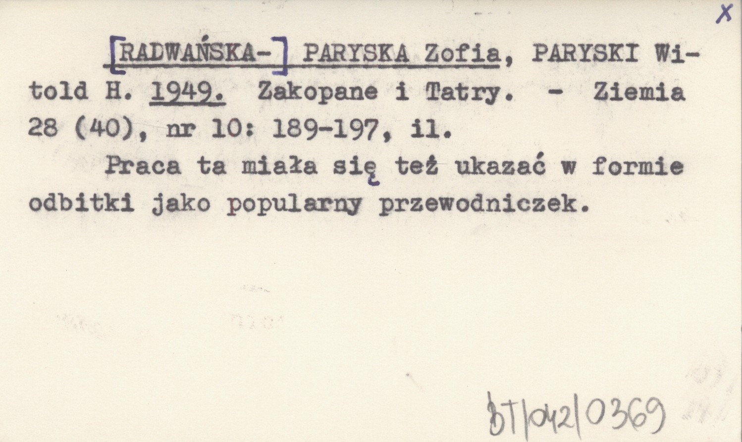 [RADWAŃSKA-]PARYSKA Zofia PARYSKI, Witold H. ; 1949 Zakopane i Tatry.